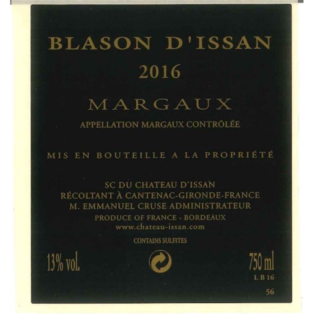 Wine Advocate 85-87 byNeal Martinthe5/2/2017 The 2016 Blason d'Issan is a blend of 40% Cabernet Sauvignon and 60% Merlot matured in 35% new oak. It has a light, slightly earthy bouquet with blackberry and autumn leaf aromas. The palate is medium-bodied with slightly hard tannin on the entry, quite crisp, but there is a touch of hardness on the finish that will need to be addressed during the élevage.