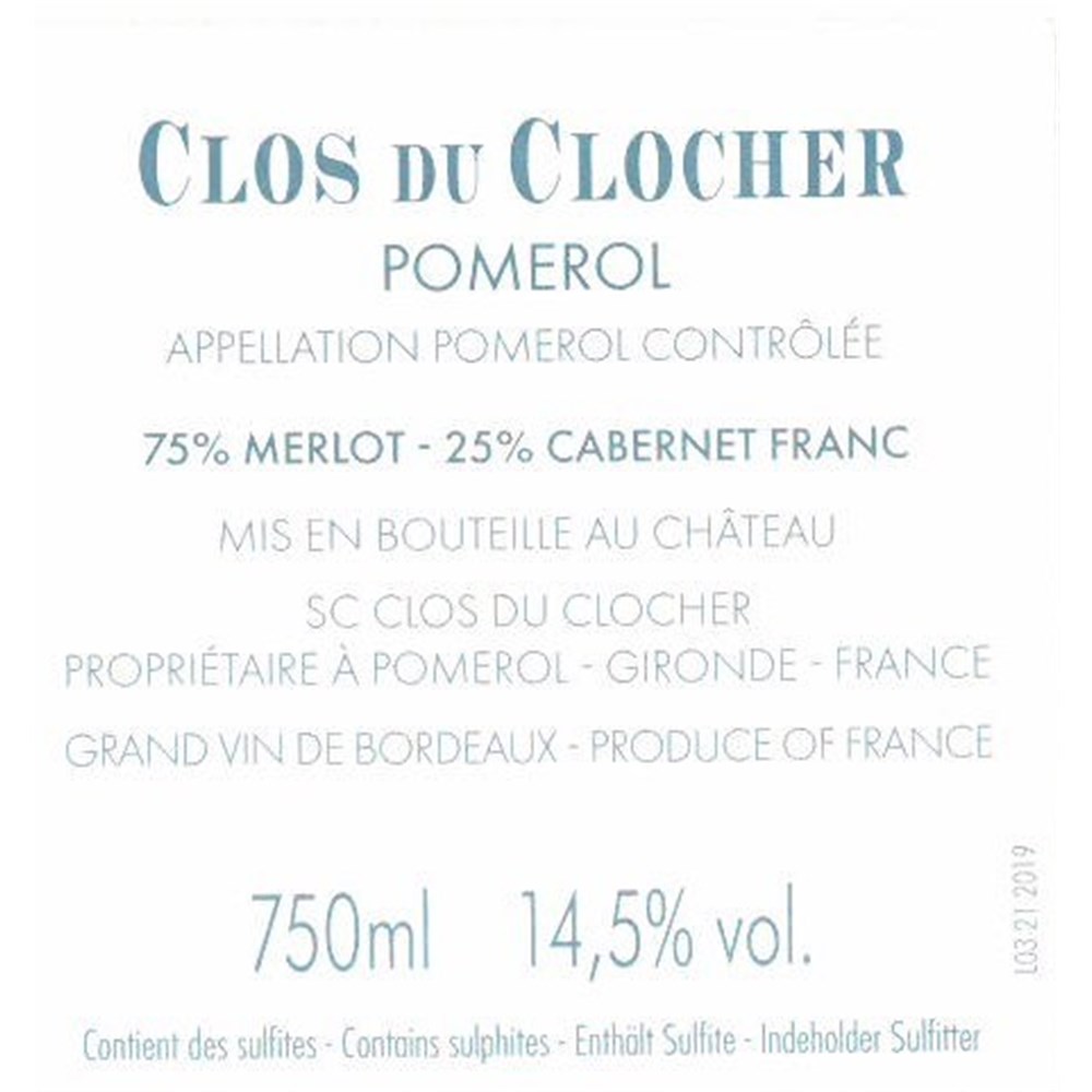 A classy, slightly restrained, yet impressive effort, the 2019 Clos Du Clocher is deep purple/ruby-hued, with wonderful cassis fruits, notes of sappy herbs, flowers, and cedar, medium to full body, ripe yet certainly present tannins, and a great finish. The cellar will be your friend on this one, and I'd hide bottles for a good 5-6 years if possible. It will have 20-25 years of overall longevity.